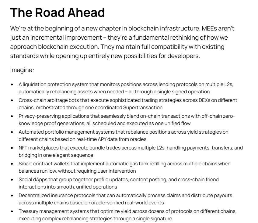 MEE와 슈퍼트랜잭션을 기반으로 한 멀티체인 가용성은 이러한 유동성 문제를 해결할 수 있는 기술적 기반으로 역할하며 온체인 경제 생태계에 더 많은 종류의 dApp이 유동성 걱정 없이 등장할 수 있도록 한다.