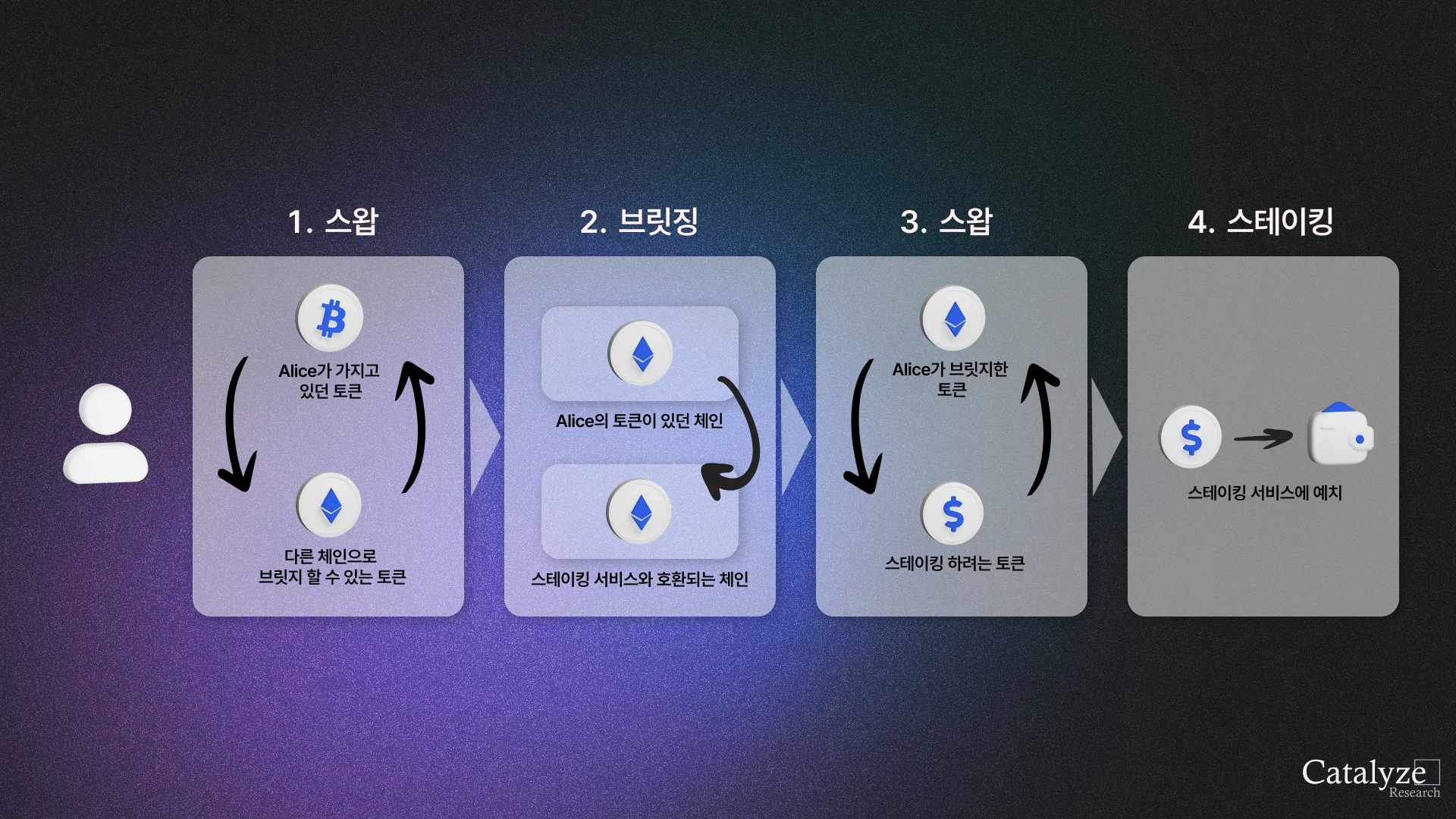 Alice라는 투자자가 어디선가 괜찮은 스테이킹(예치) 서비스가 있다는 소식을 들었다고 하자. 이 때, 그 서비스가 Alice가 주로 사용하는 체인(국가)과 다른 체인에서 제공된다면, 우선 Alice가 가진 토큰 A(화폐)를 다른 체인으로 보낼 수 있는 토큰 B와 스왑(환전)해야한다. 이를 목적 체인으로 브릿지(국제 송금)하고, 다시 그 체인에서 스테이킹하고자 하는 토큰 C로 스왑해야만 비로소 Alice가 원하던 서비스를 이용해볼 수 있다.
