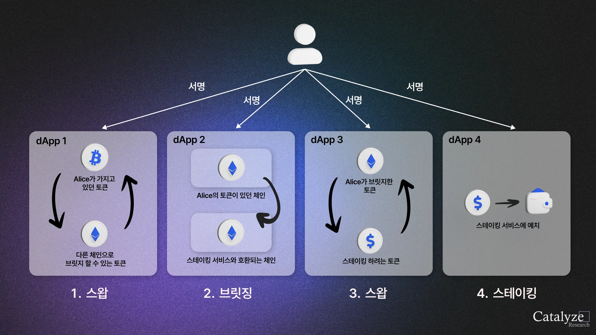 그렇다면 앞선 예시에서 Alice는 몇 번의 서명을 해야할까? 최소 4번이다. 여기에 로그인, 거래 금액 한도 설정 등을 포함하면 서명 횟수는 그 이상이 될 수 있다. 이 불편함의 꽃은 Alice가 4개 이상의 홈페이지 혹은 dApp에 들락날락 하며 트랜잭션들을 마무리해야한다는 사실이다.