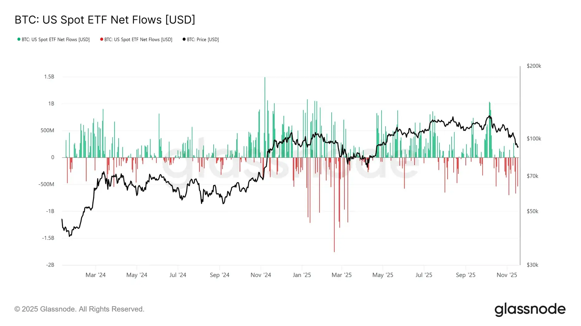 2024년 1월 BTC ETF 승인 이후, 차트의 녹색 막대(Net Flows)가 보여주듯 막대한 기관 자금이 지속적으로 유입되었다.