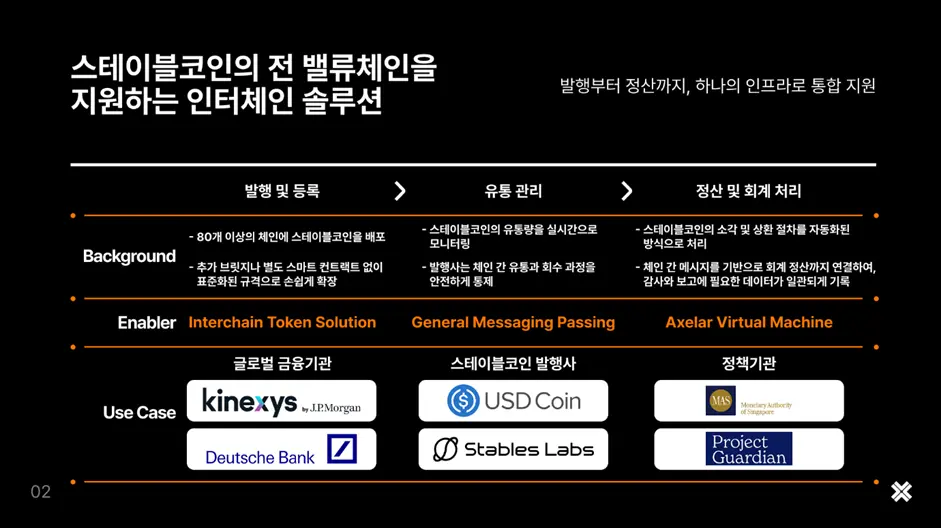 금융기관 관점에서 보면 Axelar는“발행자–체인–애플리케이션을 단일 상호운용 패턴으로 통합하는 기술 레이어”다.
