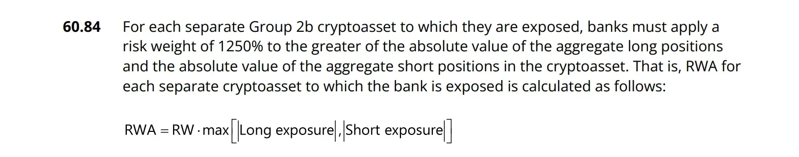 가장 대표적인 사례가 바젤 위원회의 Cryptoasset Exposures (SCO60)이다. 이 문서에서는 퍼블릭 블록체인(Permissionless) 상에서 발행된 대부분의 자산을 그룹 2b로 분류하여 1,250%라는 징벌적인 위험 가중치를 부과한다. 이는 은행이 퍼블릭 블록체인 상의 토큰화된 자산을 $1 보유하려면, 동일하게 $1의 자기 자본을 쌓아야 함을 의미한다. 이는 사실상 은행들에게 퍼블릭 블록체인을 사용하지 말라는 금지 명령과 다름없다.