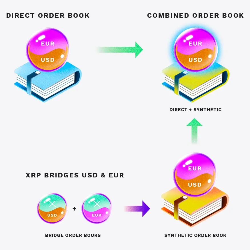 A -> XRP -> B또는A -> C -> B와 같이 가장 저렴하고 효율적인 교환 경로를 찾아낸다.오토 브릿징(Auto-Bridging): 기축 통화인 XRP를 연결 고리로 활용하여, 유동성이 적은 자산끼리의 거래도 XRP의 풍부한 유동성을 빌려와 매끄럽게 체결시킨다.