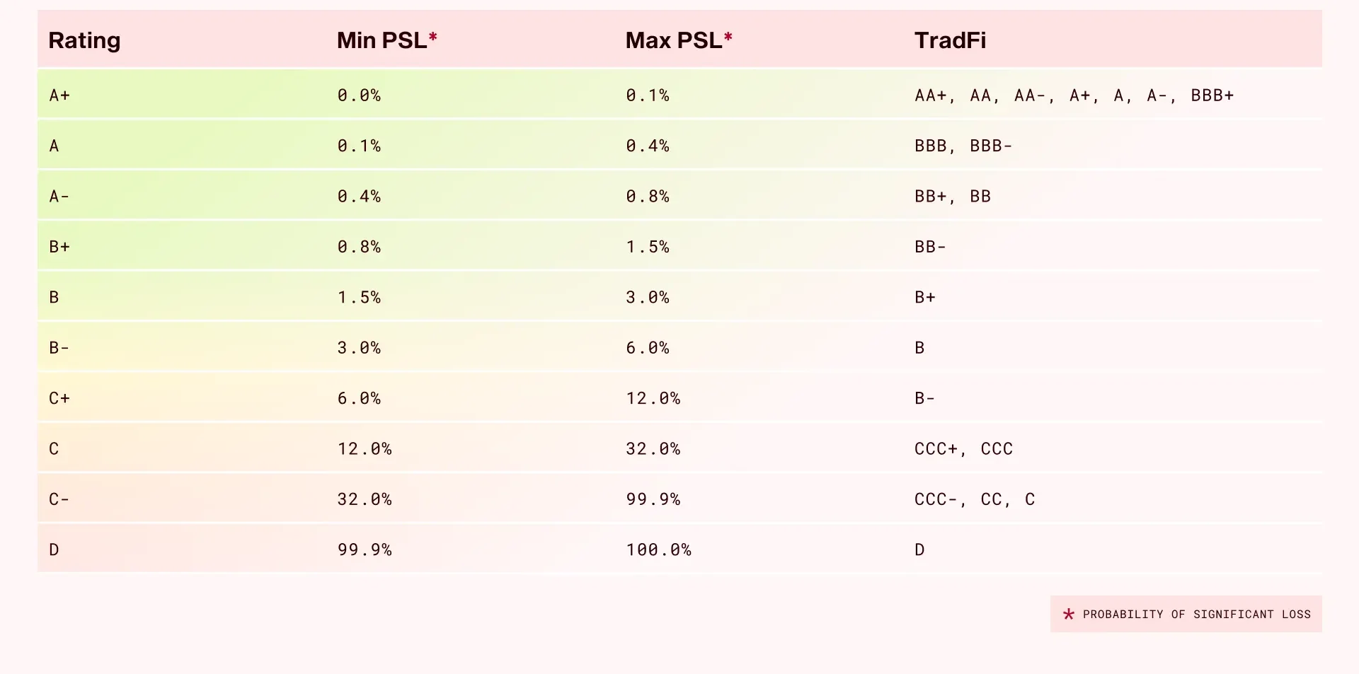 크레도라의 가장 강력한 차별점은 독자적인 DeFi Rating Scale과 Credora PD(부도확률) Curve에 있다. 크레도라는 S&P, Moody’s, Fitch 등 주요 신용평가사가 기록한 실제 채권 발행 건의 과거 부도 사례를 분석하여, 온체인 리스크를 전통 금융 자산과 동일 선상에서 비교할 수 있도록 설계했다. 특히 1990년부터 2023년까지의 방대한 데이터 세트를 통해 다양한 신용 주기를 반영했으며, 각 기관의 상이한 평가 체계를 단일 등급 체계로 표준화했다.
