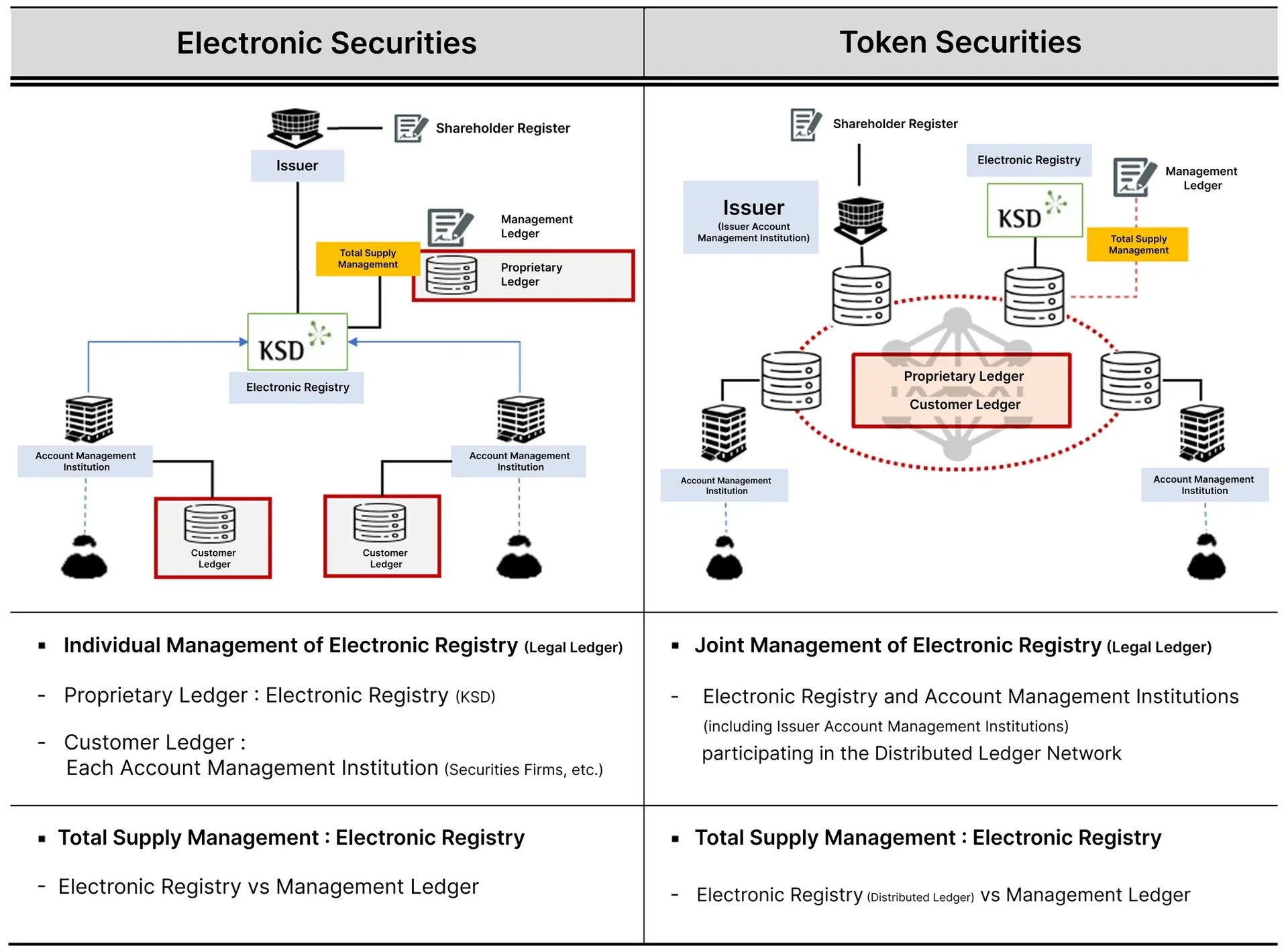 The crux of the amendments to these two major acts lies in the official recognition of Distributed Ledger Technology (DLT) as a legal electronic registration ledger. Previously, securities were recognized only when recorded on the central servers of the Korea Securities Depository (KSD). Now, records of rights changes inscribed on a distributed ledger carry the same legal presumption of rights as traditional electronic securities.